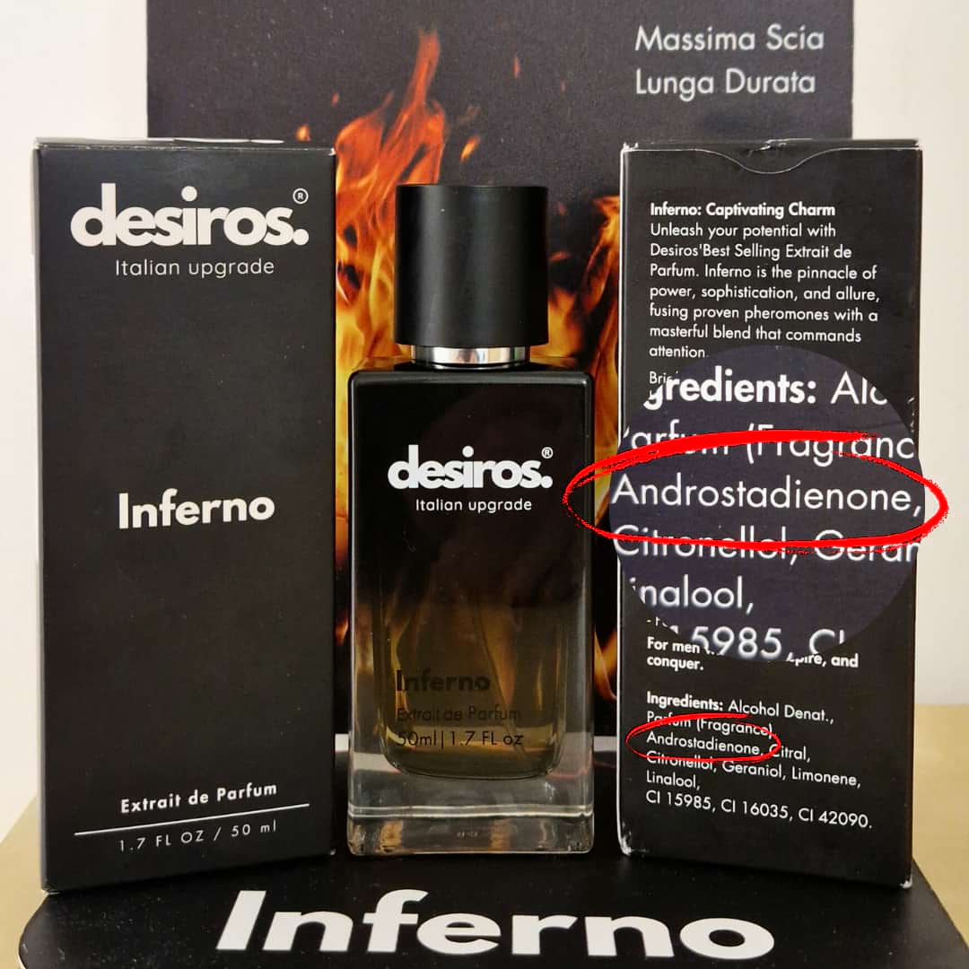 Desiros Inferno is the only fragrance in Europe formulated with selected pheromones and clearly indicated on the label .